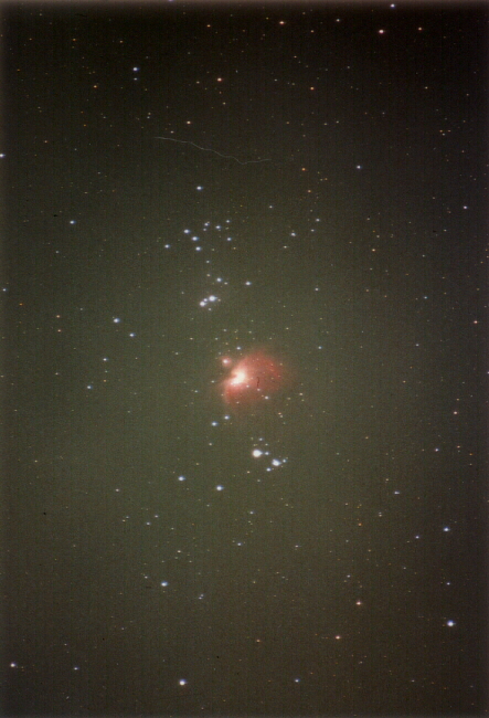 Bei dieser Aufnahme war der Orionnebel nur etwa 15° über dem Horizont. Die Brennweite betrug 400mm die Belichtung 3min 30sec bei Blende 5,6.